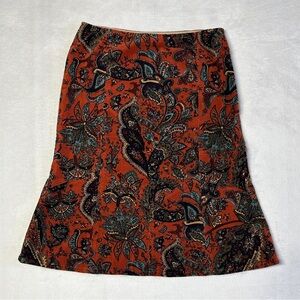 HAROLD’S Vintage Cotton Corduroy Paisley Print A-line Midi Skirt, size 10, autumn colors, the fabric stretches, side zipper, has a yellow stain inside but it is not noticeable outside, 98% cotton, 2% spandex, in good condition.