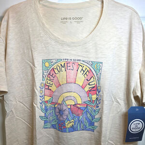 Life is Good Relaxed Tee Sunshine Womens Sz Large XL Cream Flowers Hippie Slub