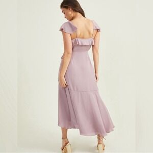 Gorgeous ruffle midi length faux wrap satin dress with flutter sleeves. Very girly and romantic.