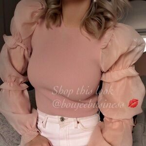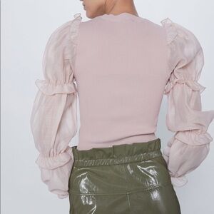 Round neck top with long organza sleeves with elastic trim and ruffles.