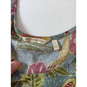 The Soft Surroundings Maxi Dress in size LG is a stylish and comfortable option for any casual occasion. This flowy dress features a v-neckline and short cap sleeves, perfect for a day at the beach or a casual summer outing. The tiered floral pattern and layered accents add a touch of femininity, while the long dress length and soft rayon fabric make it a versatile piece for the summer, fall, and spring seasons. Machine washable for easy care, this dress from Soft Surroundings is a must-have for any woman's wardrobe.