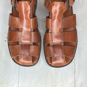 A great pair of shoes by Johnston & Murphy in Men’s size 9 1/2. Style is Domani Hurache and is a brown leather fisherman’s sandal. Side buckle for easy on and off. Good condition, just some minor signs of wear, a little wear to bottoms of soles.
