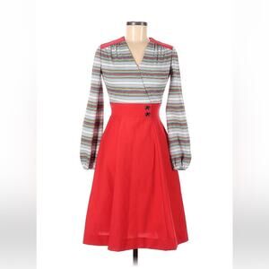 Vtg dress by G2G in red, with striped faux wrap v neck upper, faux belt waist accented with buttons, and bishop style long sleeves. Cuffs have elastic, and there is a back zipper. Union made in the USA. This one fits more like a small than a 9. Please be sure to check measurements.