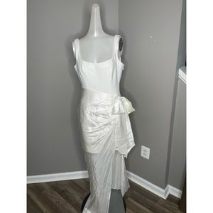 This gown features a draped skirt with an oversized bow layered over a fitted minidress.