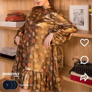 Zara Shiny Floral Print Gold Dress NWT