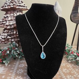 This stunning blue teardrop pendant necklace is perfect for adding a touch of elegance to any outfit. Surrounded by sparkling stones, it captures light beautifully.