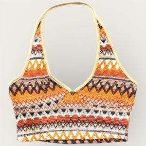 Stylish knit crop top with a vibrant pattern. Perfect for casual outings. Pair with jeans for a chic look.