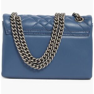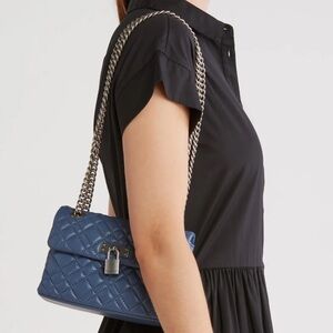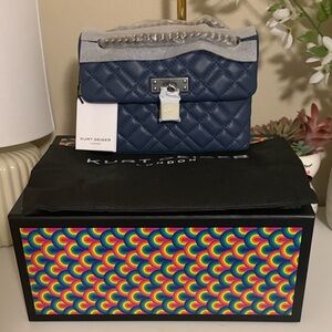 Elegant quilted handbag by Kurt Geiger. Features a sophisticated blue design with a gray trim and a stylish clasp.
