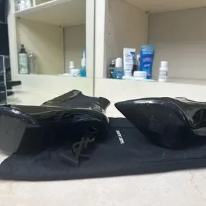 Chic and glossy heeled boots. Features iconic logo heel. Perfect for a bold statement.