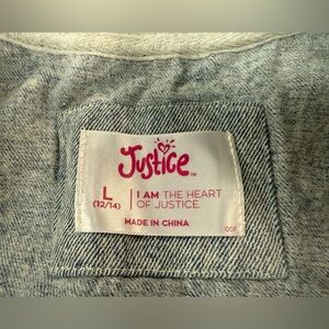 Chic bomber jacket by Justice. Features blue denim and gray sleeves. Adorned with floral embroidery. Stylish and versatile.