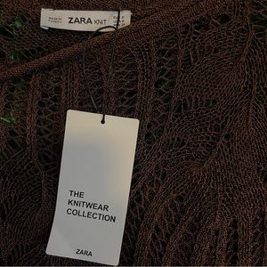 New with Tag ZARA Knitwear Collection Textured Weave Open Knit Cardigan Size Medium Brown With Scallop Detailed Bottom Trim. 82% Viscose 18% Polyester