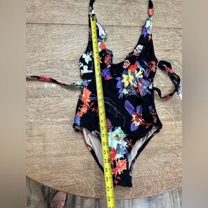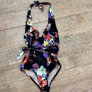 Anthropologie Allihop Ruffle Floral Halter Ruching Tie Waist One-Piece Swimsuit