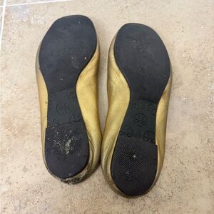 Tory Burch Ballet Flats. Size 8. Features gold coloring, luxury brand logo on toe, flat sole, elastic backing