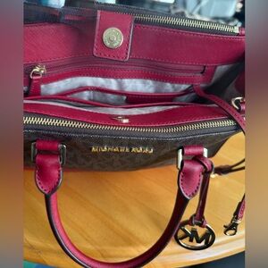 Michael Kors satchel with red and brown tones. Features signature logo and gold accents. Barely used, like new condition.