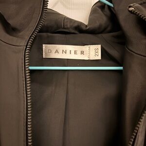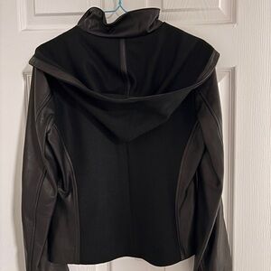 Chic black leather jacket with a stylish hood. Features sleek zipper details. Perfect for versatile wear.
