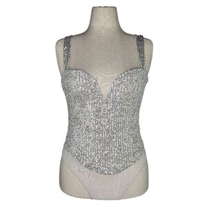 Free People Intimately Silver Sequin Thong Bodysuit L Plunge Party Festival