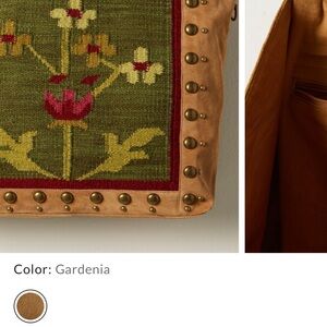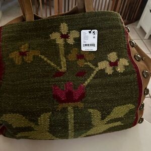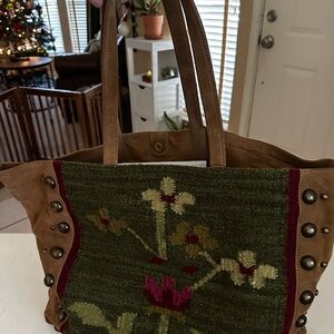 Suede & beautiful heavy woven tapestry women's bag in a perfectly boho brown and green design. Perfect for any occasion. Purse or little overnighter, laptop bag, endless options. Very sturdy and has 3 pockets inside- one w/ a zipper. I have two brand new bags- one has the tag still attached, the other has the plastic tag ring but the actual paper tag fell off. They’ve never been used or carried