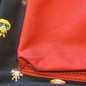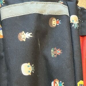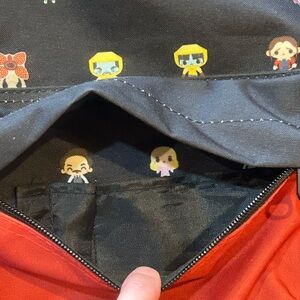 Black backpack with red front pocket featuring Stranger Things design. Includes two character figures.