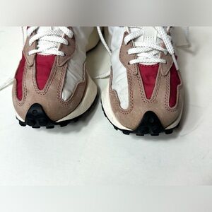 New Balance 327, in a white, pink, and red colorway size 7.5