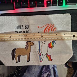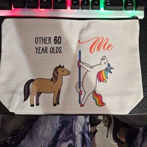 NWOT, SKU H016. Add a playful touch to your everyday essentials with this hilarious canvas makeup bag featuring a cheeky unicorn pole dancer design. Perfect for storing cosmetics, art supplies, or small accessories, this conversation starter brings humor to any occasion. The durable canvas construction and ample size make it practical for daily use, while the witty '60 year olds' comparison adds a perfect touch of humor for milestone birthday gifts.