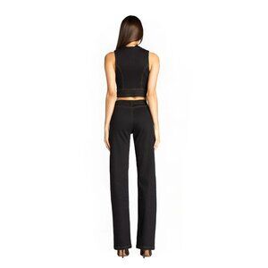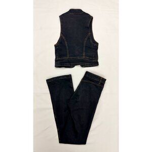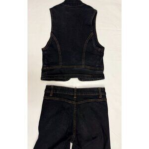 The cropped zip-front vest sculpts the torso with sharp, modern structure, while the mid-rise straight-leg pants elongate the silhouette for a sleek, commanding fit. Premium denim, heavy embroidery, and detailed contrast stitching elevate this beyond trendwear into collectible statement fashion.