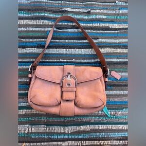 This is a gorgeous authentic early 2000s Y2K Coach Soho shoulder bag crafted in warm tan glove-tanned leather with the iconic oversized buckle closure. The bag features a softly structured, slouchy silhouette with a wide adjustable shoulder strap that sits comfortably on the shoulder, giving it that effortlessly cool, lived-in Coach look this era is known for.