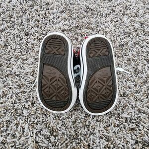 Converse sneakers with a s black and red design. High-top style with durable construction. Worn a few times around the house.