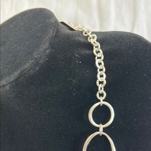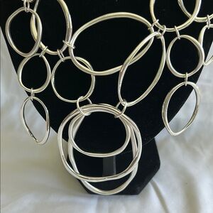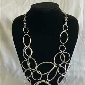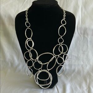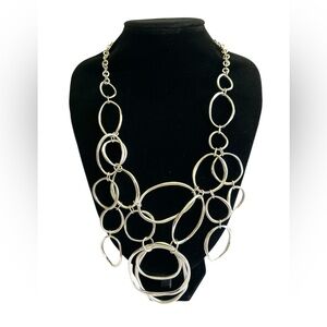 This striking Lynette Bib necklace from Chico's features a bold arrangement of interconnected silver tone rings and loops, creating a captivating geometric pattern. The cascading bib-style design adds dimension and modern flair, making it a standout accessory for any occasion.