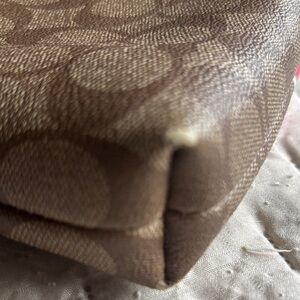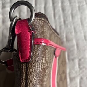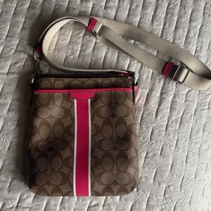 Stylish Coach crossbody with signature pattern. Features vibrant pink stripe. The leather on one of the rings that holds the strap has a crack as shown in pictures. It was glued but not painted. The leather is starting to crack on the other side. Some faint ink marks in lining but lining is in really good shape. Corners have rubbing.