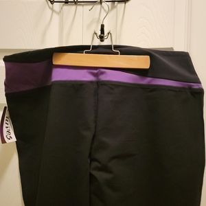 Stride Tummy Control Pants Black/Purple Size XL. The estimated measurements are Waist 17", Rise 12", and leg 31. The material is 94% Cotton and 6% spandex. New with tags