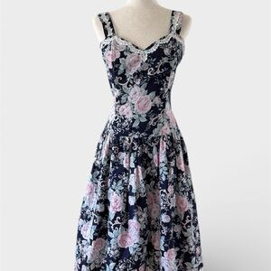 Vintage 1980s Scott McClintock Gunne Sax Floral Navy and Pink Dress