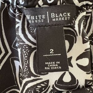 This White House Black Market dress is a size 2, regular fit, featuring a boho style with crinkle chiffon and peasant elements. It is long in length and comes in a black baroque pattern, suitable for casual occasions. Made from polyester chiffon, it has a V-neckline and a pullover closure, adorned with intricate print and metal trim. Ideal for spring, this dress is perfect for casual gatherings or a relaxed day out. Manufactured in China, it requires dry cleaning. The dress is excellent pre-owned condition.