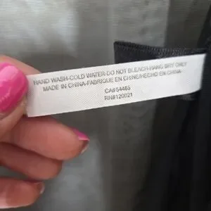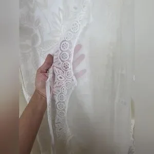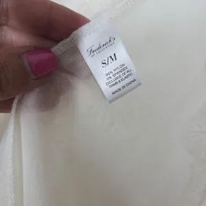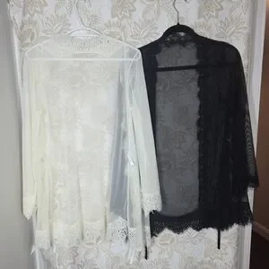 This set of 2 Frederick's of Hollywood sheer lace coverups in sizes S/M features a classic and romantic style perfect for weddings or other feminine occasions. Made of a lightweight nylon blend fabric with long sleeve and a collarless design, these robes are machine washable for easy care. The black and white colors and lace accents add a touch of elegance, making them a stylish addition to any woman's wardrobe.