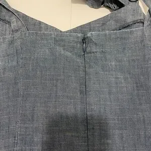 100% cotton blue chambray style fabric, zipper up the back and cute shoulder ties