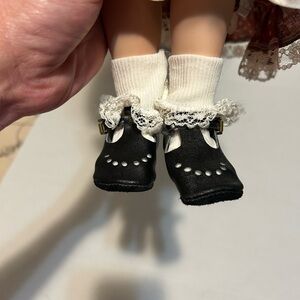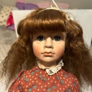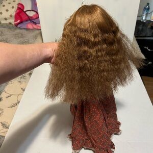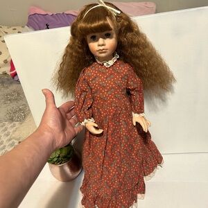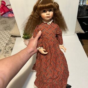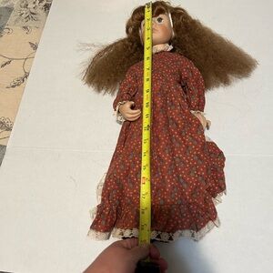 This charming doll features a classic red floral dress, perfect for imaginative play. Her long brown hair and delicate lace details add a touch of elegance.