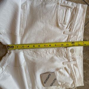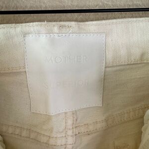 These Mother Superior premium denim jeans have a classic straight leg, 5 pocket style and zip fly. Legs feature large front patches at thighs giving a unique utility style. Ankle length 27.5” inseam. Color is called Act Natural and is an off white cream color.
