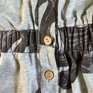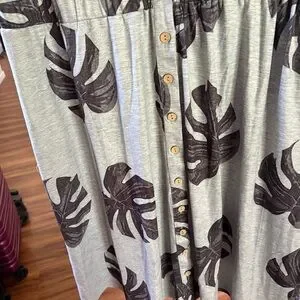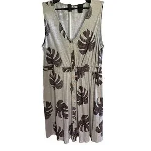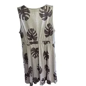 Stylish gray sleeveless dress featuring a bold leaf monsterra print. Side pockets. Pit to pit 18”, waist has large elastic, before stretch 20”, Length 38”. Perfect for casual outings.