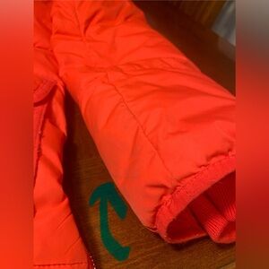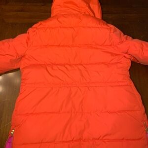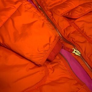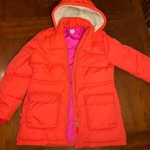 Bright red-orange hooded puffer JCrew coat. Features a vibrant pink lining. Ideal for super cold weather. Size medium. There is some slight discoloration on the left hand cuff. See photos. Otherwise coat is in excellent condition. No rips. Sizing is in the photos.
