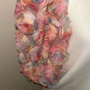 This stylish top from BiBi features a clean white bodice contrasted by short, puff sleeves in soft pink hues. The ruffled texture of the sleeves adds a touch of drama, making it a standout piece in any wardrobe.