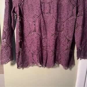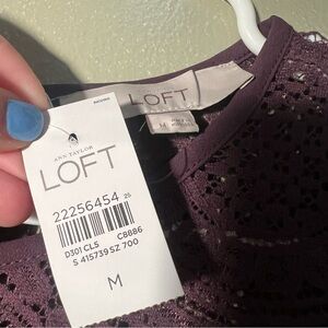 Great condition, new with tags. Loft. lace blouse. Plum purple color. 3/4 sleeve. Eyelash lace hem. Keyhole in back. Medallion pattern. Style 415739. Size medium. 66% cotton, 34% nylon. Pit to pit laying flat 19.5” Shoulder to hem 24” Sleeve (shoulder to hem) 19”. All measurements are approximate and taken lying flat. Smoke free home. No trades, offers welcome.