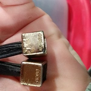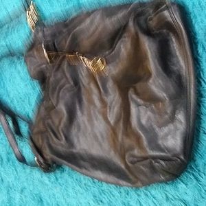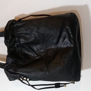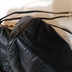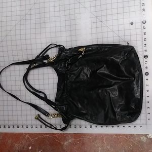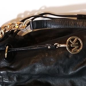 Elegant black shoulder bag with gold accents. Features a drawstring closure and MK charm. Perfect for any occasion.