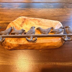 Stylish vintage cast iron hanger with 3 double prong hooks, featuring a branch with 7 song birds.