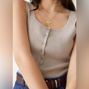Perfect tank to elevate an outfit. Knitted tank top finished with a button placket and scalloped neckline.