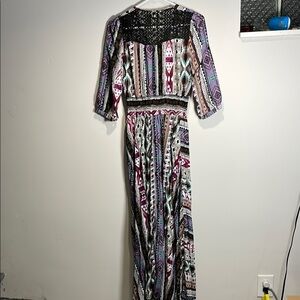 Embrace a casual resort vibe with this Jaase sundress, featuring a striking white and blue pattern. The dress boasts a flattering V-neckline and 3/4 sleeves, perfect for a relaxed yet stylish look. Its flowing design ensures comfort and ease of movement, making it an ideal choice for leisurely days