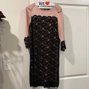Chic long sleeve dress with pink base and black lace overlay. Perfect for elegant events.
