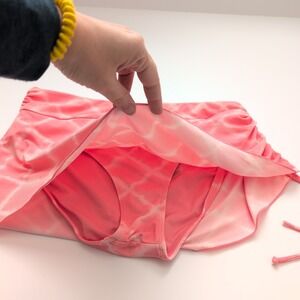 Keywords: swim skirt, tie dye, ruched, drawstring, beachwear, resortwear, poolside, vacation, athletic, active, swim shorts, pink, white