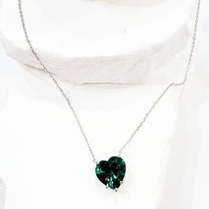 This stunning necklace from the "The Allison" collection by Melinda Maria features a large, faceted emerald-colored heart cubic zirconia (CZ) stone that beautifully catches the light. It is perfect for layering