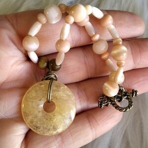 This elegant beaded bracelet features a stunning yellow gemstone pendant, perfect for adding a touch of sophistication to any outfit. The warm tones of the cats eye beads complement the gold beautifully, making it a versatile accessory for any occasion.