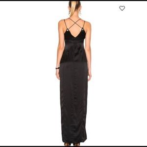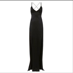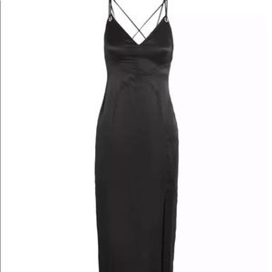 Elegant black maxi dress. Features a sleek silhouette. Spaghetti straps and side slit.
