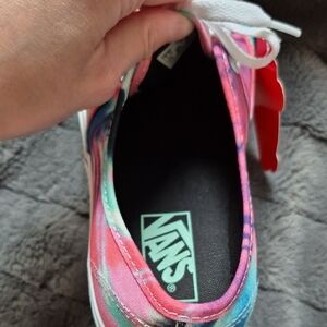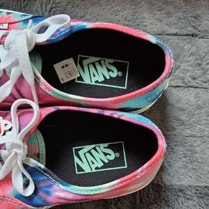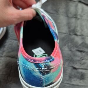 NWT Bold tie-dye design with blue, pink, green, and white. Signature Vans look with white laces. Canvas upper; signature waffle outsole. Size 7 Men; 8.5 women.